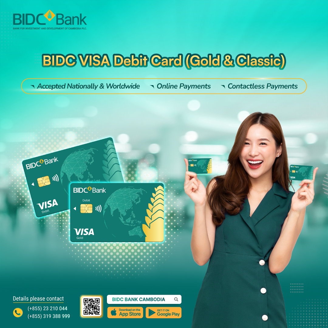 BIDC is a partner of VISA to offer customers a convenient, secure international debit card, customers shall enjoy with carrying cash less and purchasing online. With BIDC VISA Debit card allowed you do cash withdraw from millions of global and domestic VISA, Plus ATM networks and purchase with Tab & Pay at Point of Sale (POS) and eCommerce purchasing.