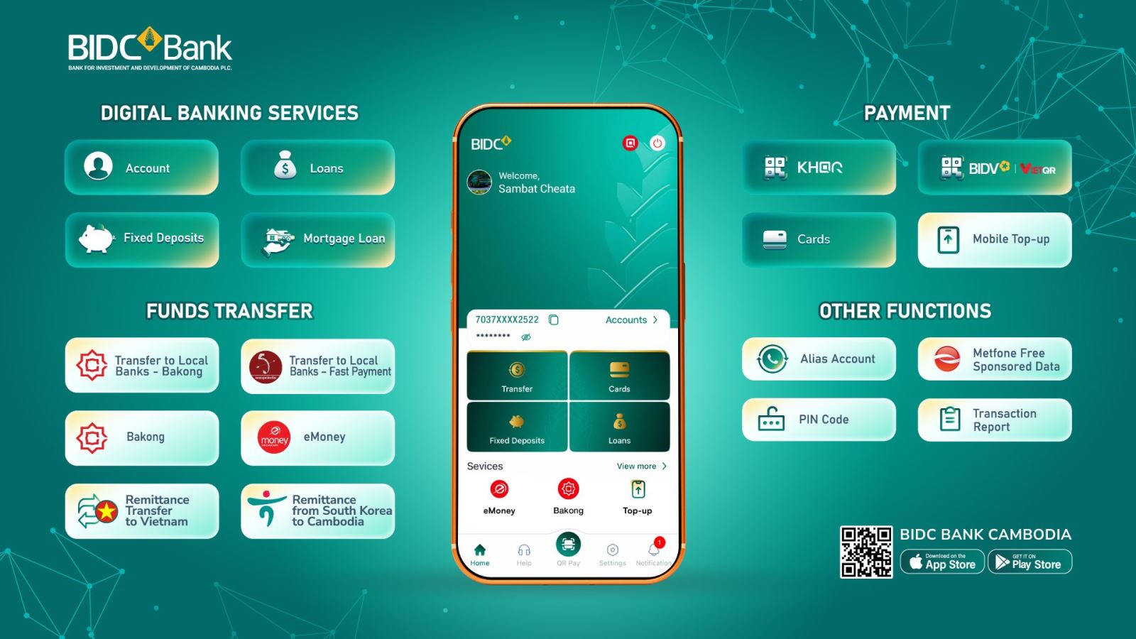 The application BIDC Mobile Banking Cambodia is the digital banking service installed on smart phones, tablets by BIDC provides personal customers to perform the banking financial transactions, non-financial transactions and perform other utilities