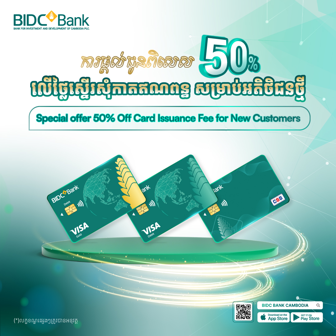 Now’s the perfect time for new BIDC customers to apply for BIDC card and enjoy 50% OFF issuance fees. The promotion applies to BIDC VISA EMV Classic, BIDC VISA EMV Gold, BIDC CSS Card and FREE for BIDC VISA Virtual Card.